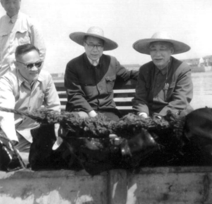 1965年6月,国家教育部副部长叶圣陶(右一)在海洋所副所长曾呈奎(左一)、山东海洋学院生物系主任方宗熙(左二)、海洋所副所长郭志坚(站)陪同下,在青岛观察海带生长情况。海洋所供图