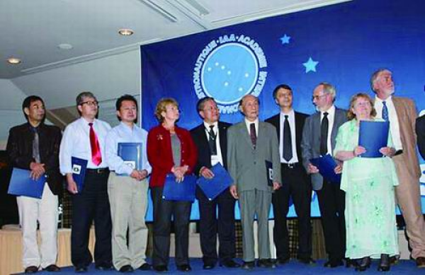 2010年,“双星计划”与“星簇计划”联合团队部分获奖成员在于捷克布拉格举行的IAA颁奖仪式上。(受访者、空间中心供图)