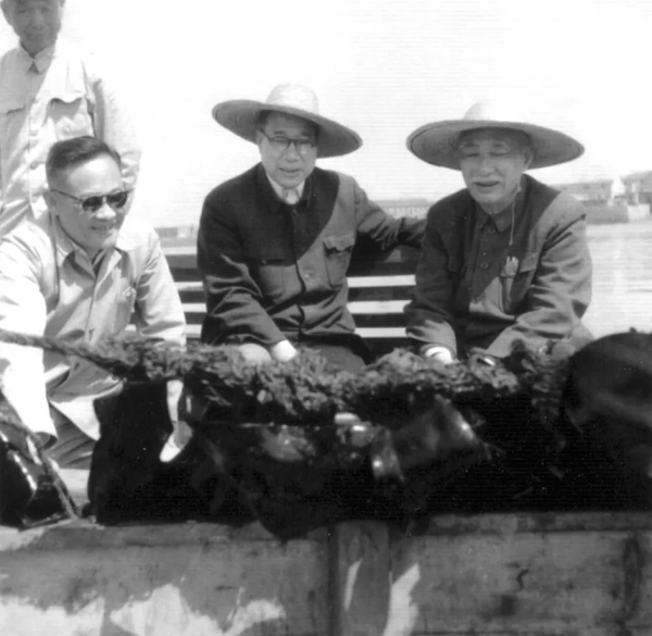 1965年6月4日,教育部部长叶圣陶(右一)在时任海洋所副所长曾呈奎(左一)、山东海洋学院生物系主任方宗熙的陪同下,在青岛近海舢板上观察海带生长情况。海洋所供图