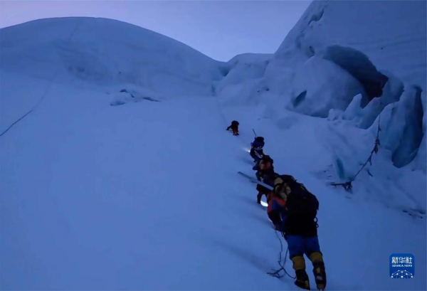 10月1日,科考队员在冲顶过程中。新华社发