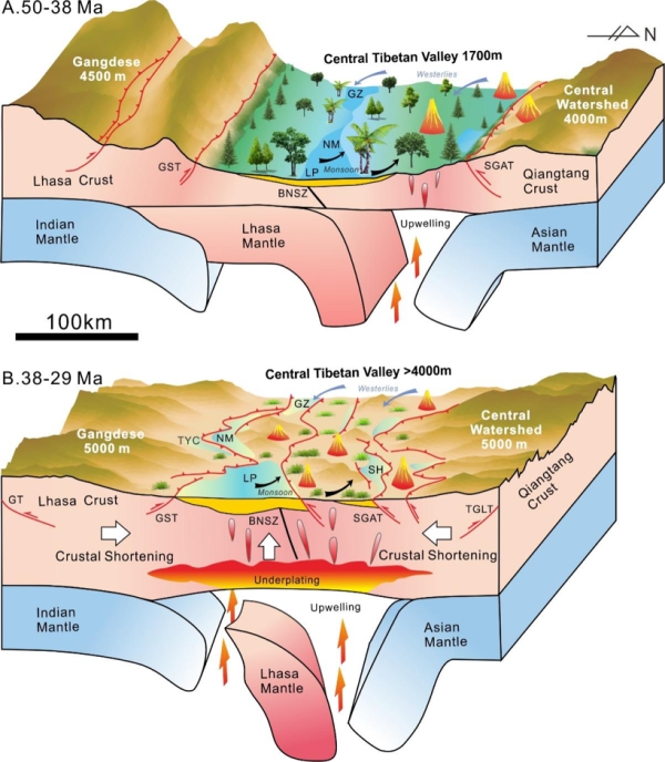 图1.青藏高原中央谷地3800-2900万年前隆升和消亡过程。A.5000-3800万年前:青藏高原呈现为“两山夹一盆”的地貌特征,即高海拔的冈底斯山脉和中央分水岭山脉之间夹着低海拔的中央谷地。中央谷地气候温暖湿润,降水由西风和季风共同主导,亚热带动植物繁盛,是高原内部的“香格里拉”。B.3800-2900万年前:中央谷地快速隆升为大于4000 m的高原,地表温度下降,降水减少,且降水主要受季风控制,高山草甸为主要地表植被