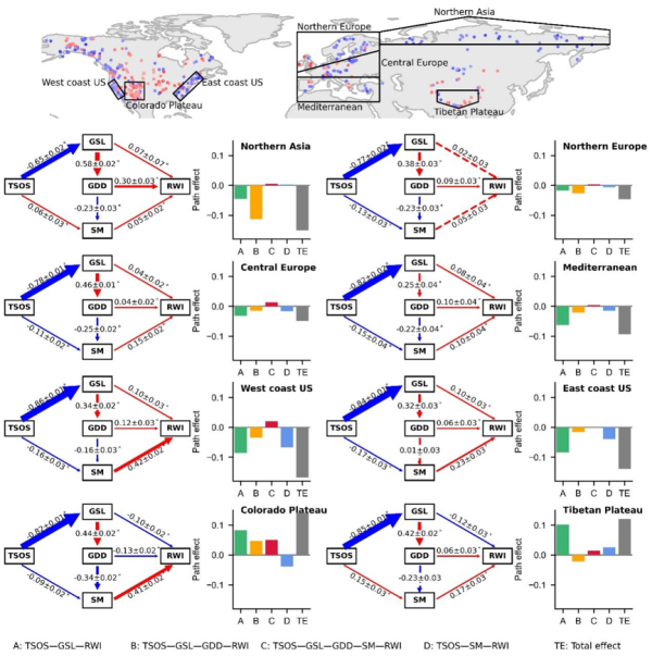 图2.不同区域生长季提前对树木径向生长影响的过程机理(TSOS:生长季开始时间,GSL:生长季长度,GDD:生长季积温,SM:生长季土壤含水量,RWI:树轮宽度指数,TE:总效应)