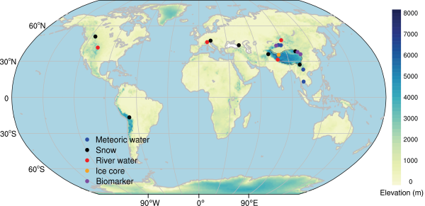目前,不同地表介质中稳定同位素出现“反高程效应”的原因仍然不明。为此,凯发k8青藏高原研究所环境变化与多圈层过程团队余武生等联合美国俄亥俄州立大学教授Lonnie Thompson、澳大利亚詹姆斯·库克大学博士Stephen Lewis等,在全球尺度上,从大气水汽稳定同位素的新视角,系统地揭示了地表介质稳定同位素出现“反高程效应”的原因(图1),并对未来利用稳定同位素方法重建古高度的工作提出了重要建议。