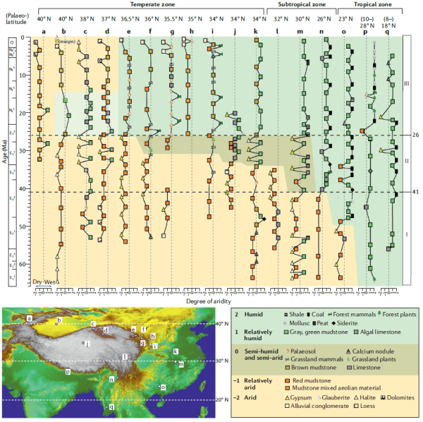 图2 代表性盆地/剖面岩性记录半定量反演的亚洲气候时空演化 (a,Ulugqat剖面;b,塔里木盆地;c,柴达木盆地西部;d,柴达木盆地边缘;e,西宁盆地;f,兰州盆地;g,临夏盆地;h,黄土高原;i,渭河盆地;j,羌塘;k,南阳盆地;l,囊谦盆地;m,江汉盆地;n,云南;o,百色盆地;p,尼泊尔;q,Irrawaddy盆地)