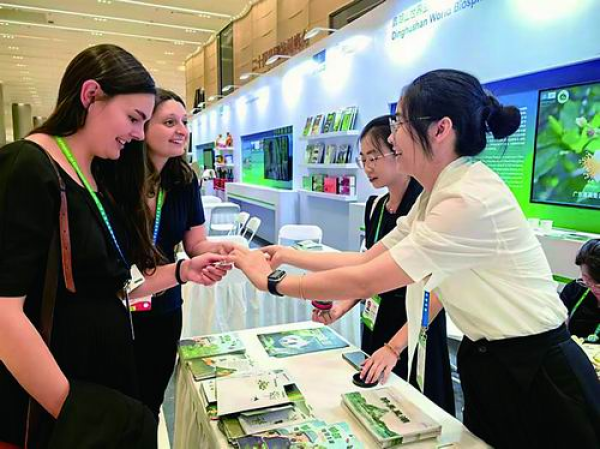 国际参会者在鼎湖山世界生物圈保护区的展台前了解“中国经验”。倪思洁/摄