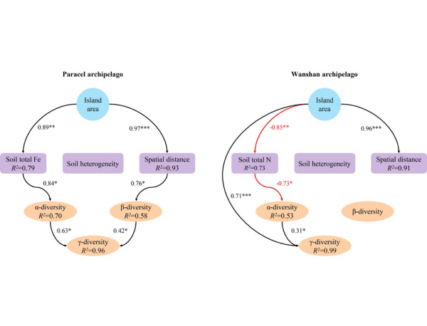 图2. 两组岛屿面积如何影响γ多样性的结构方程模型