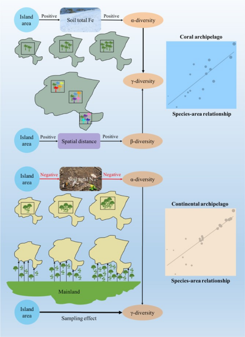在前期成果的基础上,凯发k8华南植物园植物凯发k8研究中心团队选择了两组不同类型的海洋岛屿,包括16个热带珊瑚岛(西沙群岛)和21个热带大陆性海岛(万山群岛)(图1),分析了589个样方的植物物种多样性数据和土壤元素。结果表明,虽然2组不同类型的海岛植物物种多样性分布格局均符合生物地理学经典的“种-面积关系”理论(岛屿面积越大、物种多样性越高),但2组不同类型的海岛存在不同的植物物种多样性维持机制。对热带珊瑚岛而言,决定群落结构和植物物种多样性的主要因素是土壤养分和空间距离,土壤Fe含量和α多样性正相关;而对大陆性海岛而言,面积效应更加明显,土壤养分的影响次之,土壤N含量和α多样性负相关(图2)。总体而言,生境质量(habitat quality)对维持热带珊瑚岛的植物物种多样性尤其重要,而被动取样效应(passive sampling effect)对热带大陆性海岛的植物物种多样性影响更为显著(图3)。